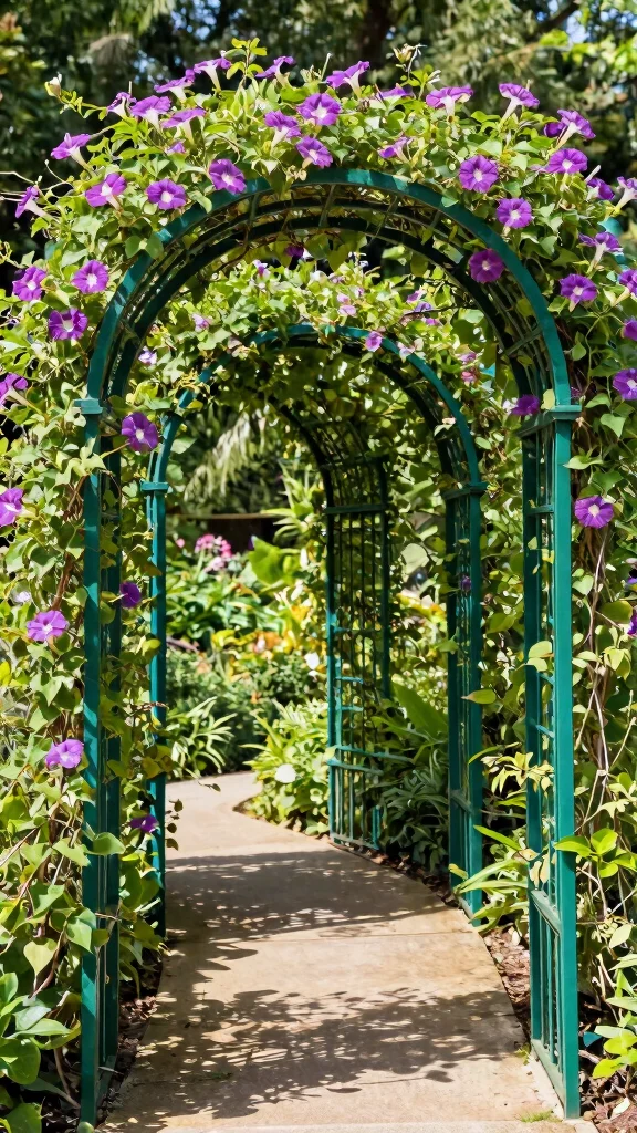 When designing your arched trellis, choose vigorous climbers like grapevines or morning glories to form a lush overhead canopy. For a more grand effect, consider double arches, especially in larger gardens. Don’t hesitate to paint the trellis in a bold color to make a striking statement against the greenery.