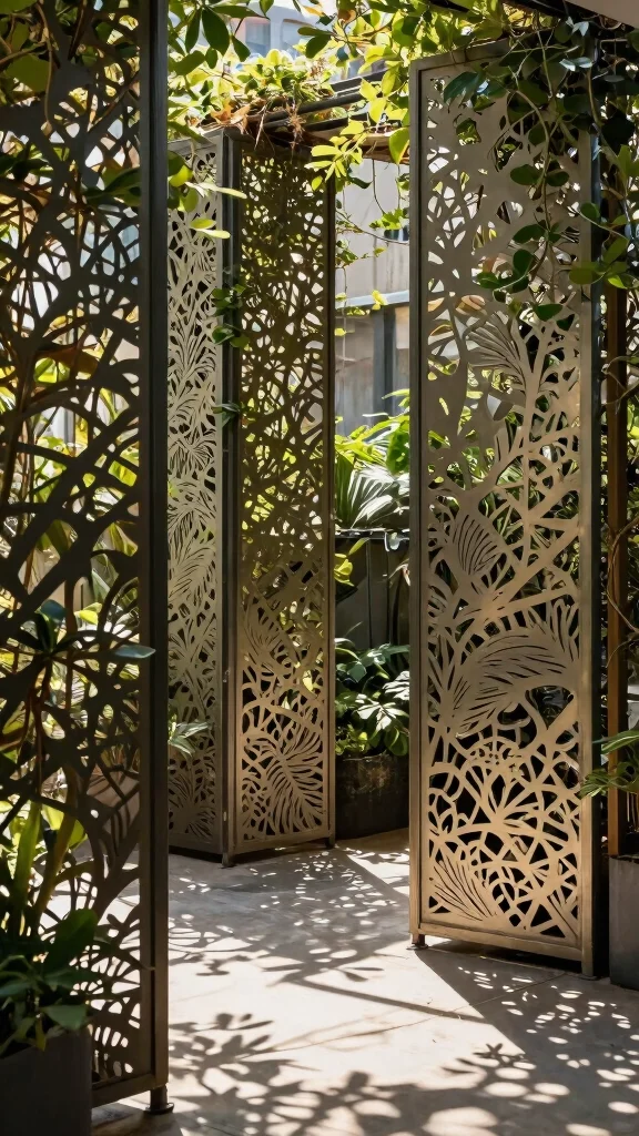 Transform your garden into a work of art with decorative metal panels that double as trellises. These panels, featuring intricate cut-out designs, not only provide support for climbing plants but also allow light to filter through, adding an artistic flair to blank walls.