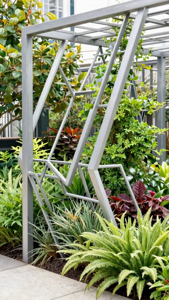 A geometric trellis stands as a striking feature, transforming your garden into a stylish retreat as plants flourish around it.