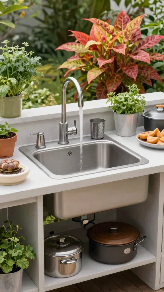 Opt for compact sink units that blend seamlessly into your outdoor kitchen design. Integrate storage underneath for dish soap and cleaning supplies for added practicality.