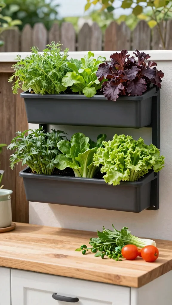 Utilize wall-mounted planters or shelving to create a beautiful green backdrop while saving precious floor space. A small countertop can be included for washing and prepping your fresh produce, enhancing your culinary adventures!