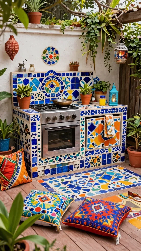 Fun fact: adding a mosaic-tiled countertop and colorful cushions turns your outdoor kitchen on deck into a magnetic social hub. People linger, plates disappear, and evenings feel like a festival.