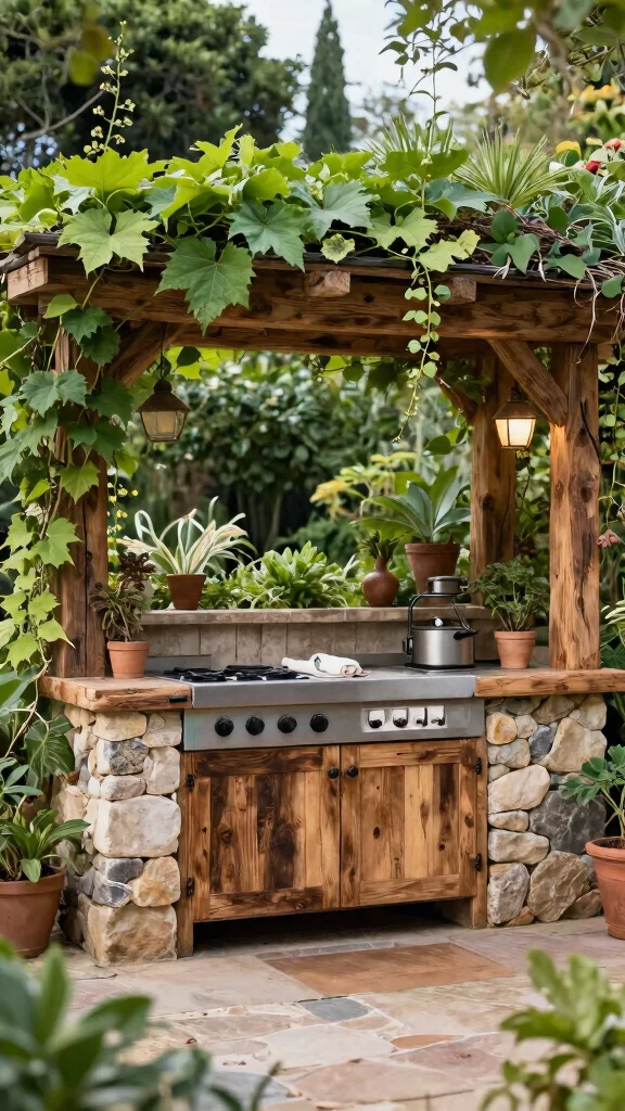 Ingredients: – Reclaimed wood and natural stone for countertops – Garden elements like climbing plants – Comfortable seating that blends with nature