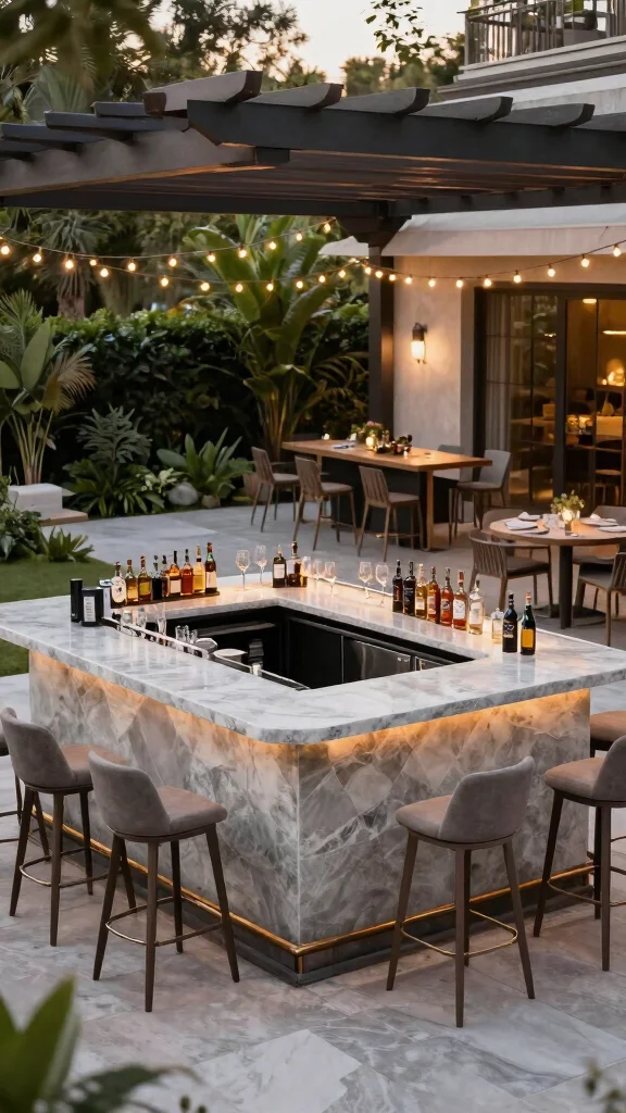 Sleek Outdoor Bar Stone/wood bar, stools Casual seating, glassware Add string lights for ambiance