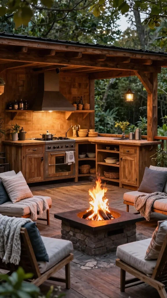 Rustic Wooden Kitchen Wood, fire pit Cozy seating, natural elements Keep fire pit safe distance
