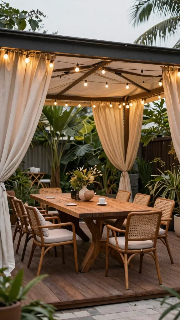 FAQs: – What fabrics are best for outdoor use? Look for weather-resistant materials for cushions and drapes.