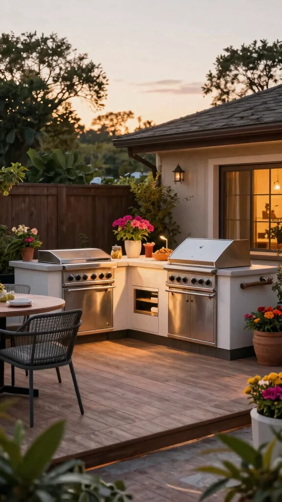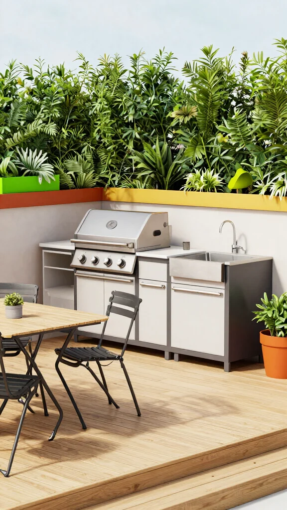 Compact Outdoor Kitchen Modular units, foldable furniture Space-saving design, vertical planters Opt for durable materials