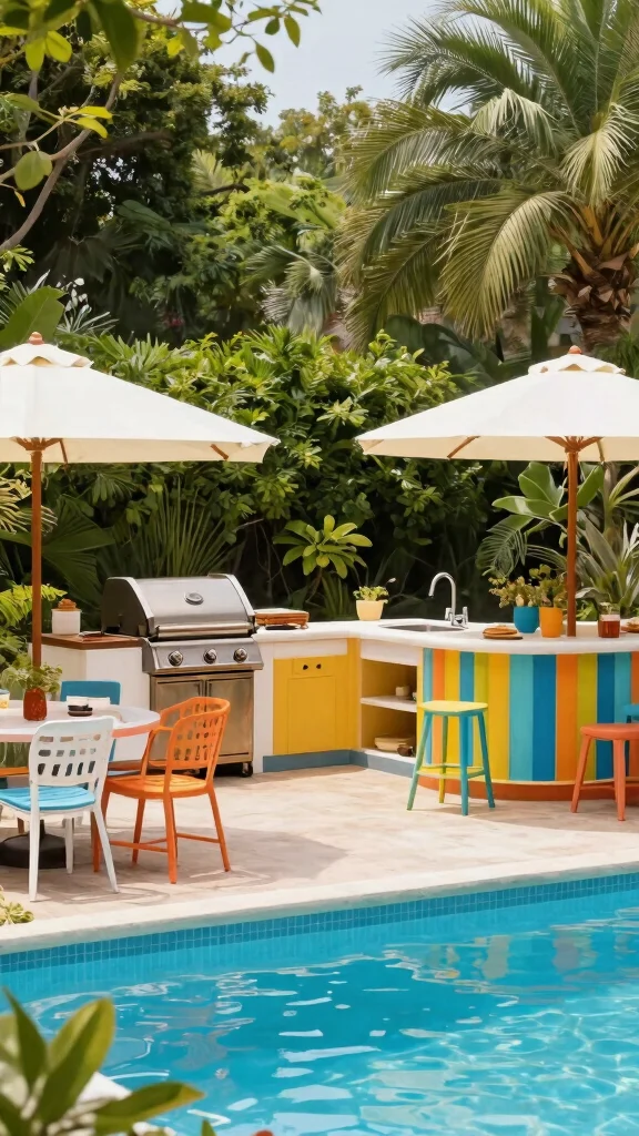 Ingredients: – Outdoor kitchen setup (grill, sink, refrigerator) – Bar seating (weather-resistant) – Colorful outdoor furniture