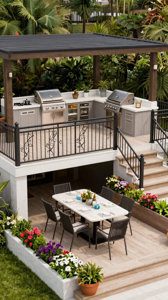 Ingredients: – Multi-level deck design – Safety railings or decorative planters – Complementary furniture for various heights