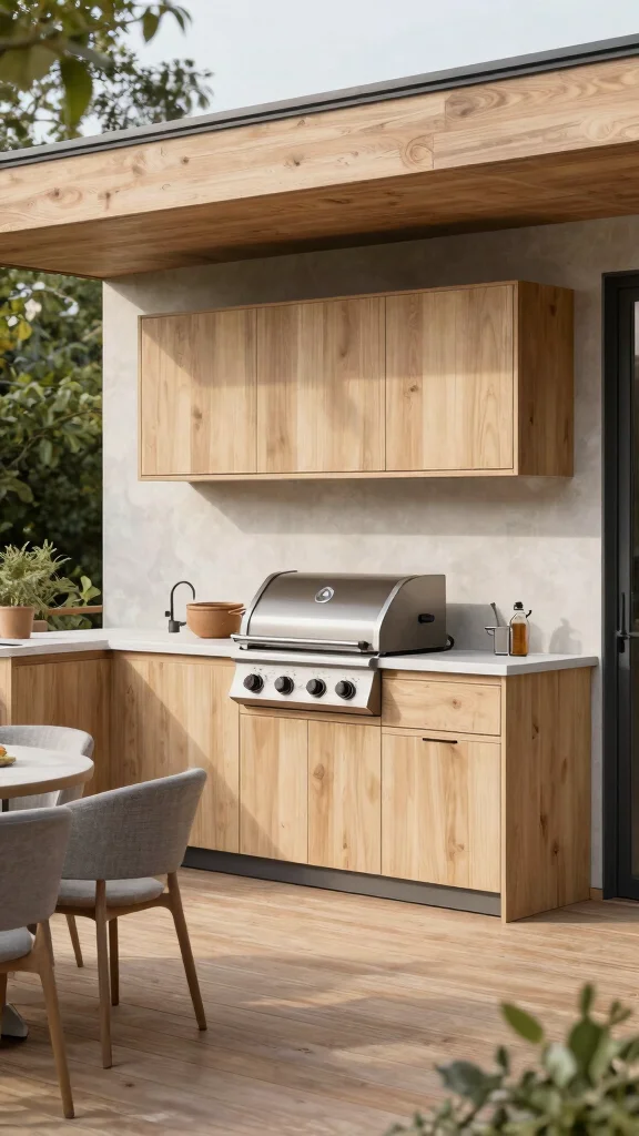 Do you appreciate simplicity and functionality in your outdoor spaces? A chic Scandinavian design embodies clean lines, light colors, and natural materials, creating an inviting cooking area. This style often includes a compact grill and minimal prep space, seamlessly integrated into the overall aesthetic. Soft, neutral tones paired with lush greenery enhance the tranquil atmosphere, encouraging relaxation and enjoyment of your meals.
