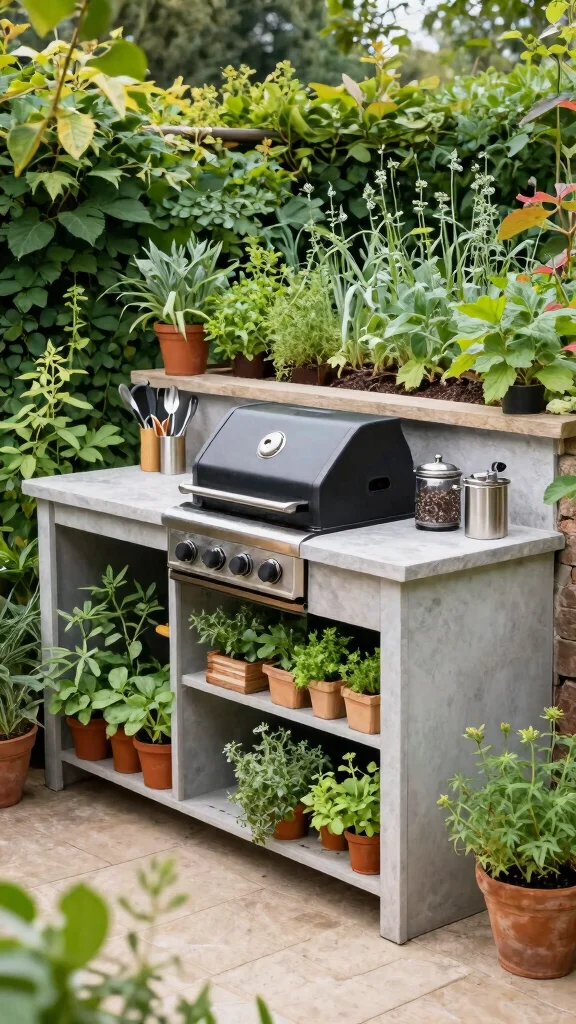 This layout not only enhances your cooking experience but also keeps everything organized. You’ll find built-in cabinets to store all your grilling essentials and a narrow countertop for easy meal prep. Plus, consider vertical gardening options to keep fresh herbs like basil and rosemary right at your fingertips.