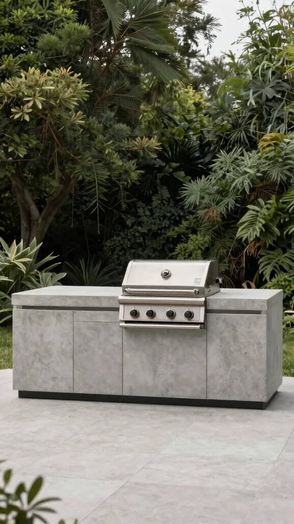 With an integrated grill and prep area featuring clean surfaces, you’ll find limited but functional storage to keep your essentials organized. Using natural materials like concrete and wood creates an organic feel that blends beautifully with nature.