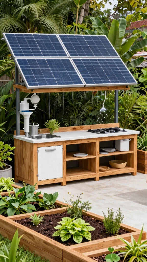 With solar panels powering your appliances and lighting, you can enjoy cooking while caring for the planet. A rainwater collection system can be used for irrigation and cleaning, and raised beds allow you to grow your own vegetables right next to your kitchen.