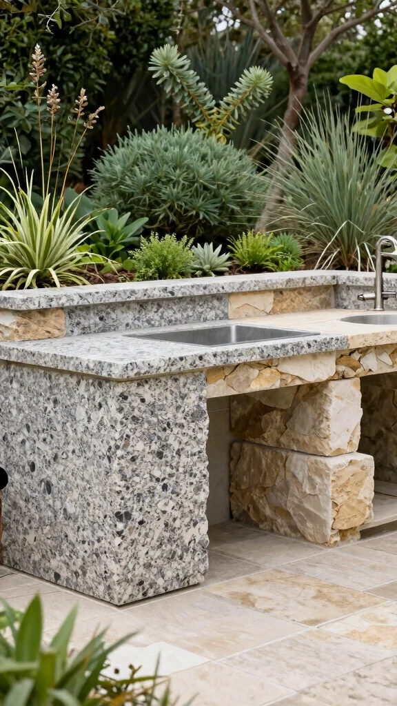 ❝Concrete stone finishes prove durability and style can team up in outdoor kitchens. They’re highly customizable in color and texture, yet easy to maintain, making eco-friendly outdoor kitchen stone spaces practical and beautiful. Your rugged outdoor kitchen will age gracefully—without breaking the bank.❞