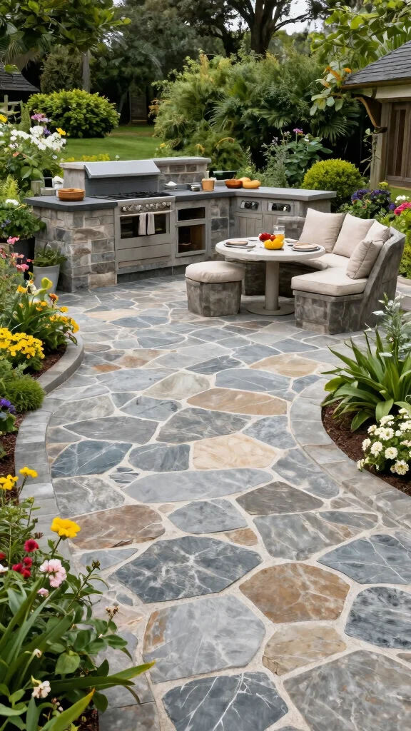 Want to create a cozy outdoor kitchen atmosphere? Flagstone patios are a fantastic choice. Their natural, textured surface adds charm and rustic elegance to your cooking space. You can lay flagstone in various patterns, offering a personalized touch that reflects your style. Plus, its slip-resistant quality makes it safe for wet conditions, allowing you to enjoy your outdoor kitchen year-round.