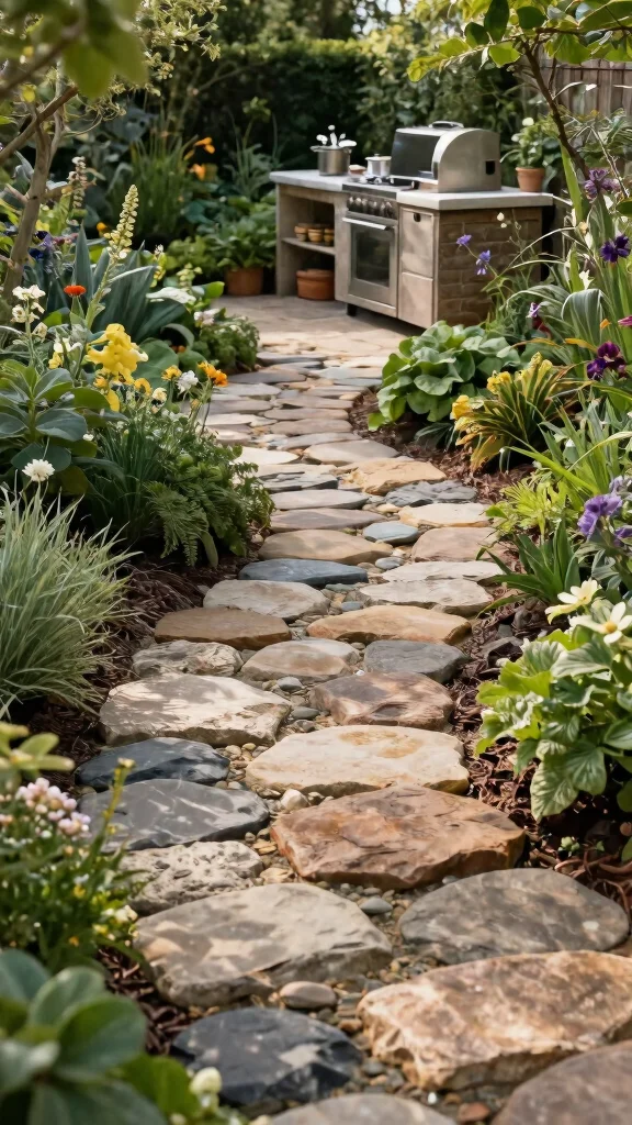 River rock pathways enhance the charm of your outdoor kitchen while adding functionality and sustainability to your gardening efforts.