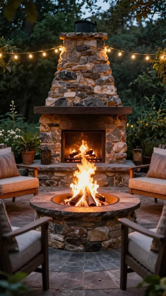 A stone fire pit brings functionality and charm to your outdoor kitchen, inviting you to enjoy evenings outdoors.