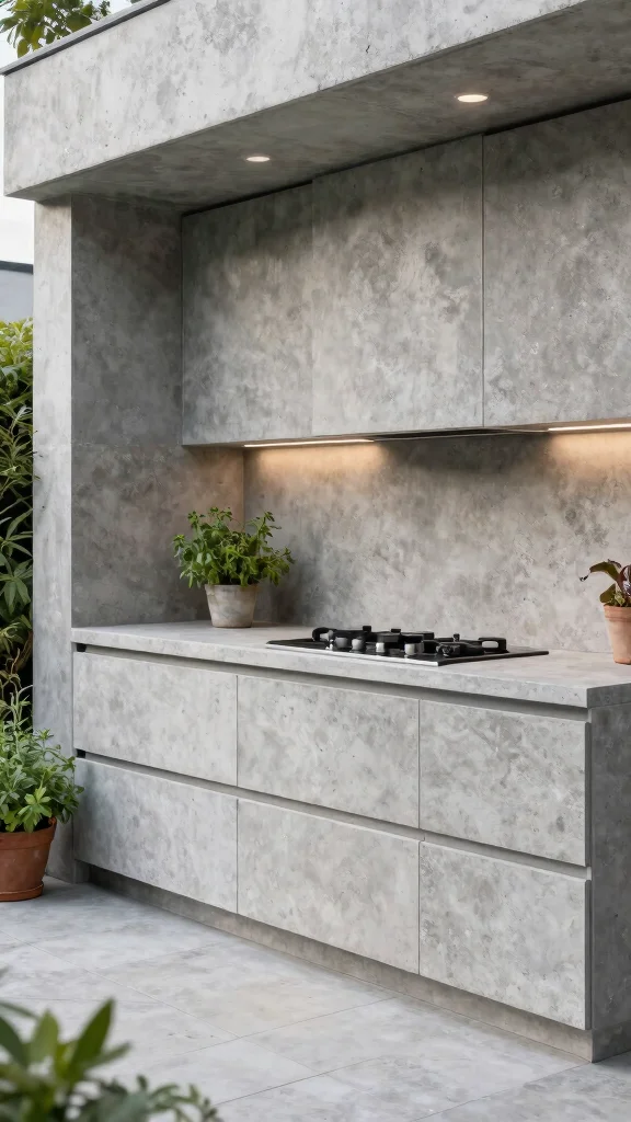 Looking for a modern twist on rustic design? Concrete stone finishes offer a stylish solution. This versatile material can replicate the look of natural stone while being cost-effective and easy to maintain. You can create stunning countertops, walls, and flooring that enhance your outdoor kitchen’s charm. Concrete allows for customization in color and texture, fitting your personal style perfectly.