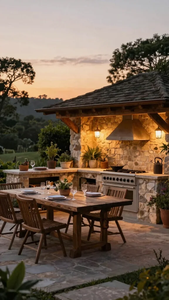 How can I design an outdoor kitchen that blends rustic charm with durable stone countertops?