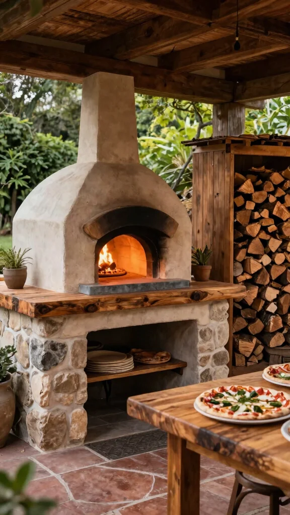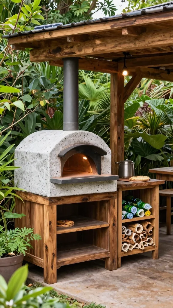 Opt for reclaimed wood for countertops and storage to create a harmonious look. A stone base for the oven complements the natural environment beautifully, and a firewood storage area keeps things practical yet stylish.