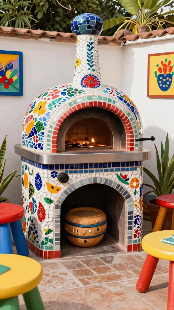 Incorporate artistic tiles around the pizza oven for a standout feature and choose colorful furniture and accessories to enliven the space. Create a mural or artwork on a nearby wall to enhance the aesthetic further.