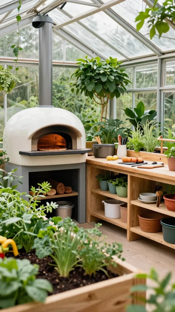 Imagine merging your love for gardening with outdoor cooking by creating a greenhouse kitchen. This innovative concept allows you to grow fresh ingredients right next to your pizza oven, ensuring the most flavorful meals. It offers an immersive and sustainable cooking experience.