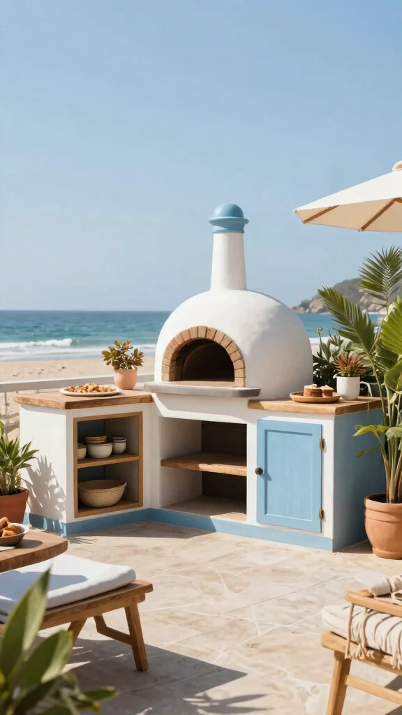 Bring the beach to your backyard with a coastal-inspired outdoor kitchen. A pizza oven set against soft blues and whites evokes a sense of seaside relaxation, perfect for summer gatherings with friends and family.