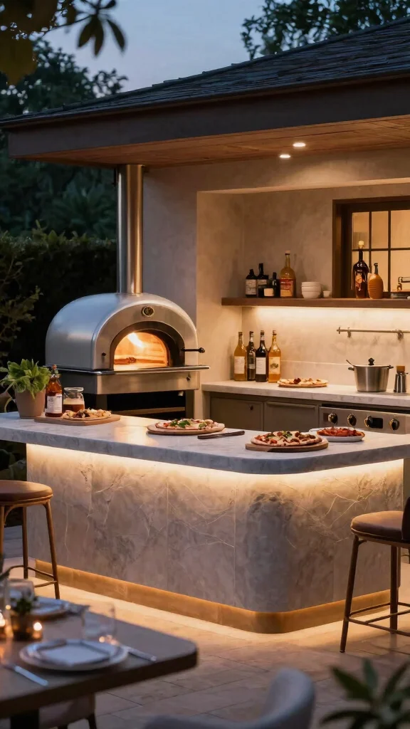 Embrace high-end materials like granite or marble for surfaces, and ambient lighting adds warmth during evening gatherings. Incorporate a built-in sound system to elevate the outdoor experience.