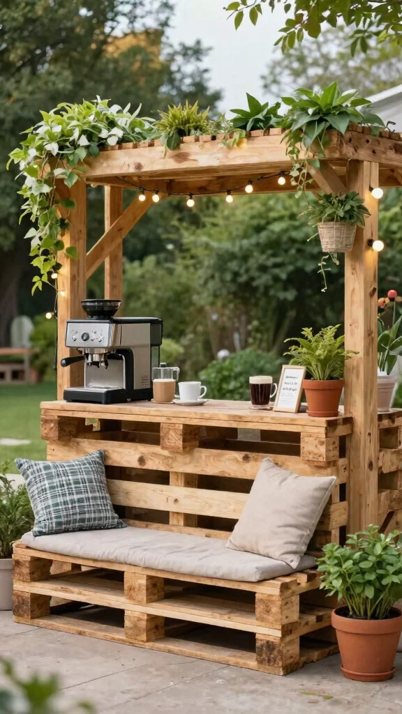 This coffee station can feature a pallet base for your coffee maker, storage for beans and cups, and even some seating for sipping your morning coffee. Adding charming decor like fairy lights or potted flowers will enhance the relaxing atmosphere as you enjoy your fresh brew.