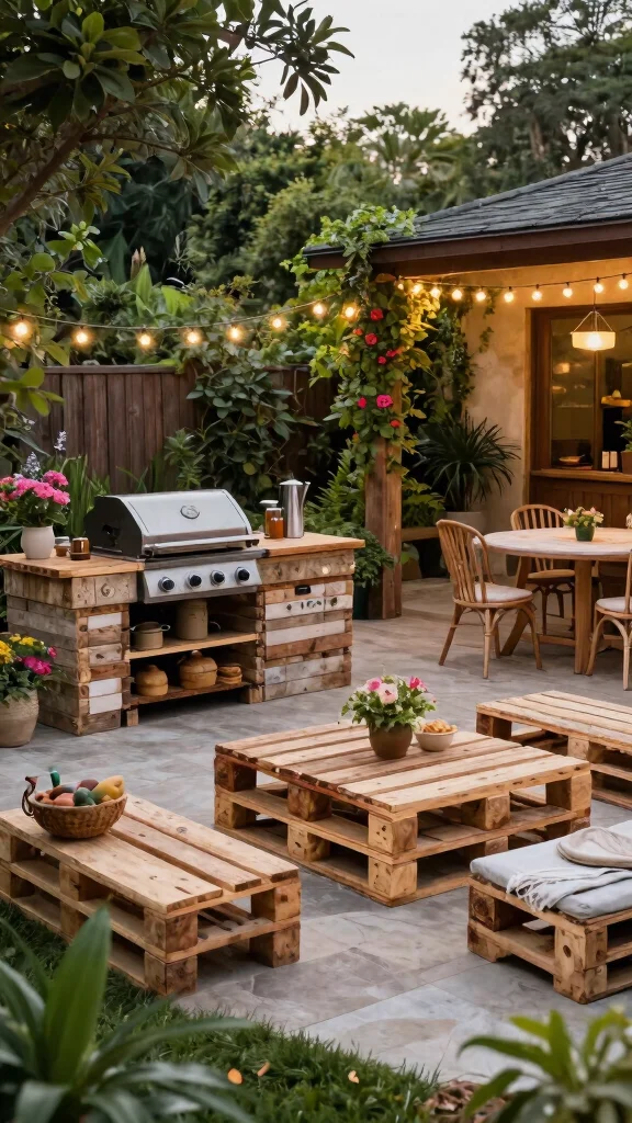 Question: What are some easy pallet furniture ideas to complete a DIY outdoor kitchen setup on a budget?