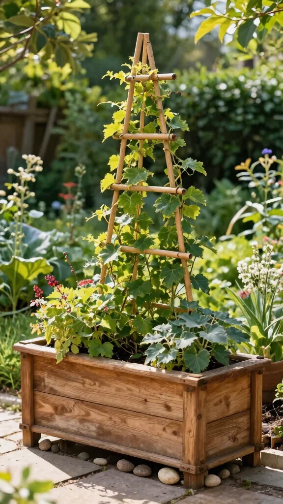 Begin by choosing a robust wooden box and securing vertical bamboo poles to form the trellis. Position your climbing plants at the base, so they can easily ascend as they grow. This setup is excellent for cultivating edible plants, giving you the pleasure of fresh produce right from your garden.