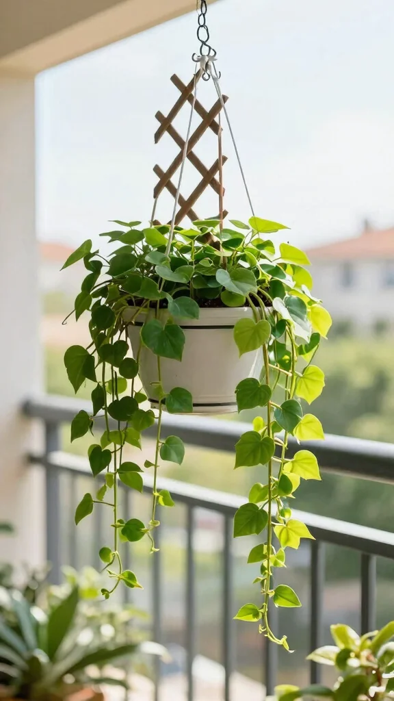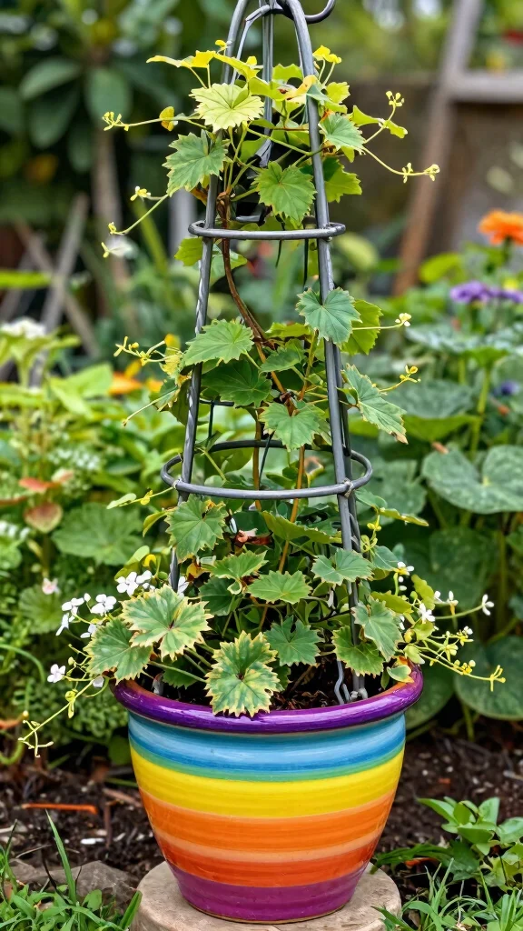 Select a ceramic pot in a lively color to contrast with the greenery, then attach a twisted metal trellis for a stylish climbing surface. As the plants spiral upward, they will create a stunning visual effect that’s sure to catch the eye.
