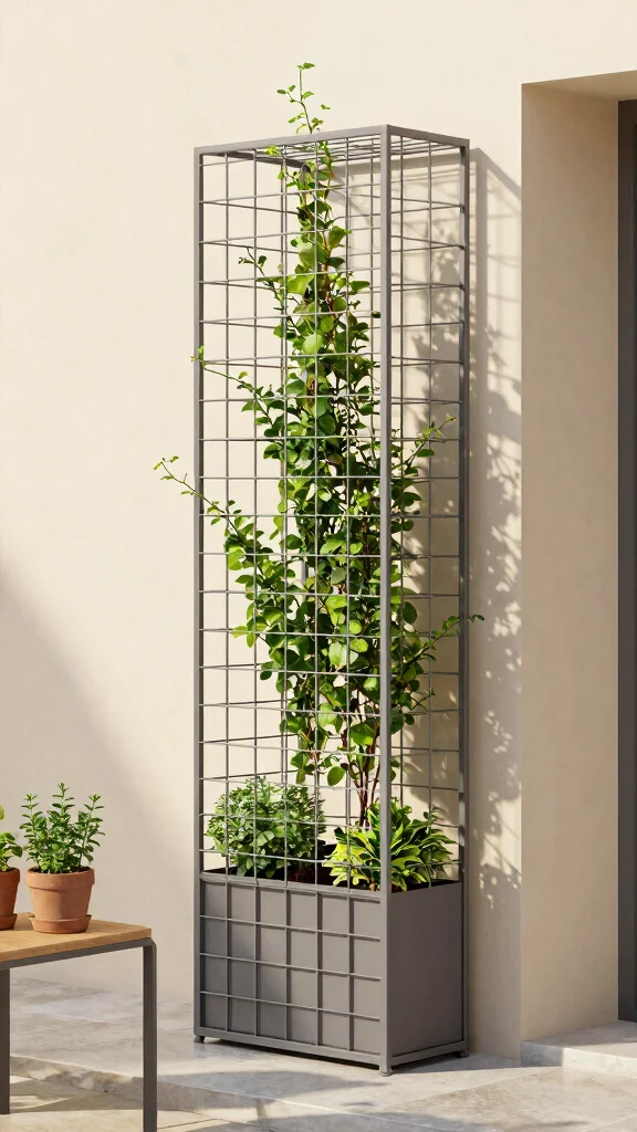 For those looking to incorporate a touch of modern design in their gardening, a vertical metal grid trellis attached to a planter box stands out. This industrial-style setup is not just visually appealing but also highly functional for climbing plants like Ivy or Jasmine. The sleek metal grid allows your plants to climb elegantly, creating a stunning vertical display.