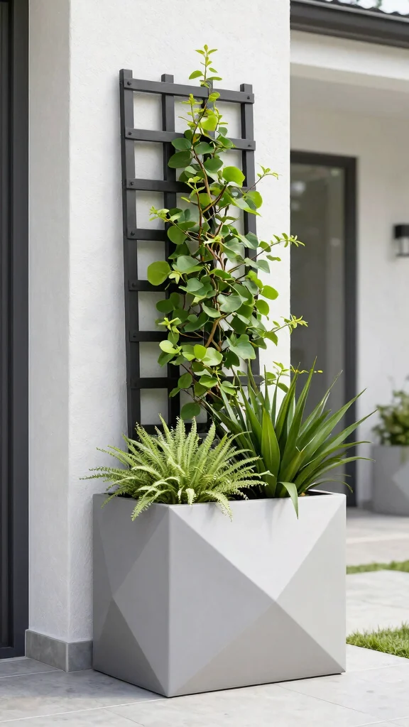 For a chic and contemporary addition to your garden, a geometric planter box with a sleek trellis can become a standout feature. These planters can be crafted from wood or concrete, instantly elevating the look of any outdoor area. Climbing plants like honeysuckle or sweet peas thrive beautifully in this stylish arrangement.
