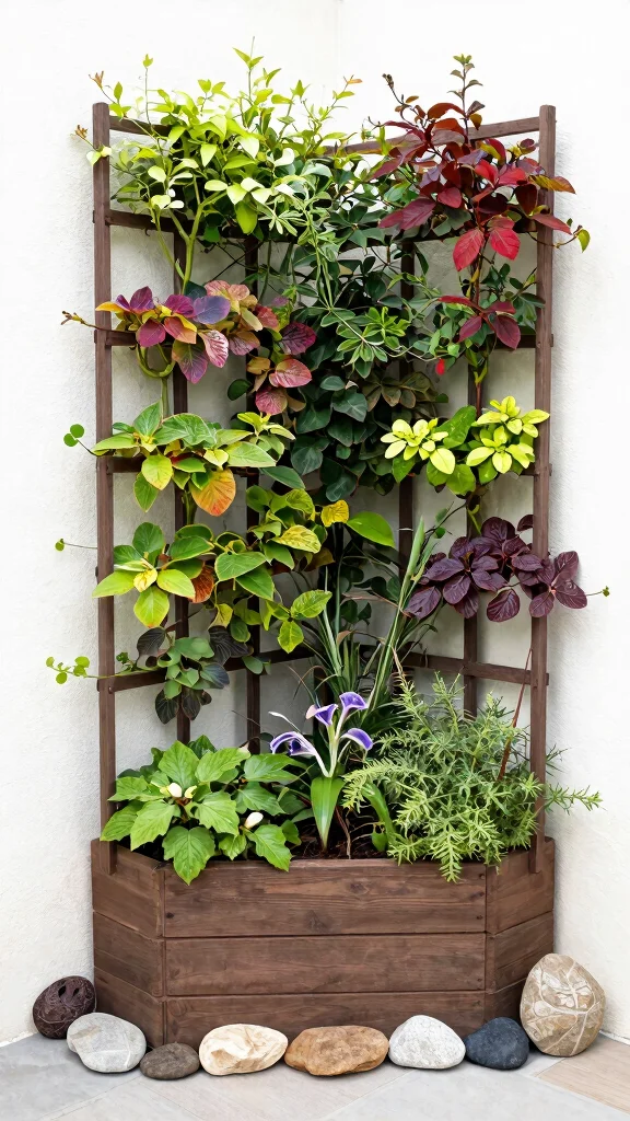 To create this, securely attach a sturdy hanging planter to a strong support and affix a vertical trellis. Plant your climbing varieties at the top, allowing them to cascade beautifully downwards. This design not only maximizes your available space but also adds a unique touch to your vertical garden.