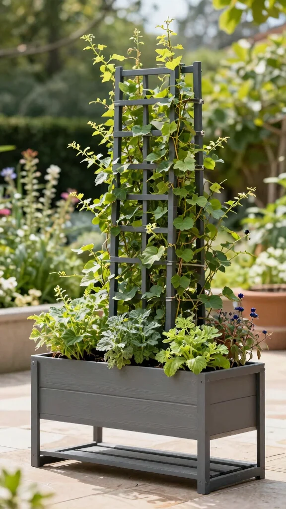 That setup lets vines climb the trellis while the box keeps roots contained, turning walls, balconies, or narrow corners into productive green space.