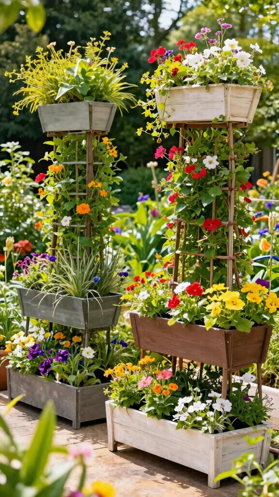 Maximize limited space by using vertical planter boxes with trellises to create height and visual interest in your garden.