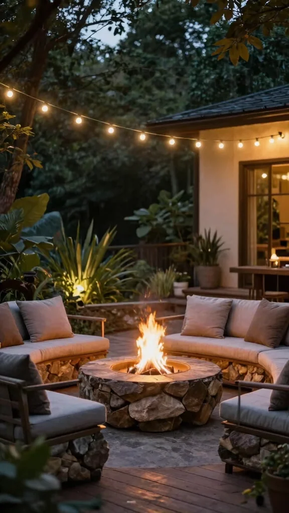 Add ambient lighting with string lights, sconces, and warm LED lamps to create inviting evenings, plus a focal point like a fire pit or water feature.