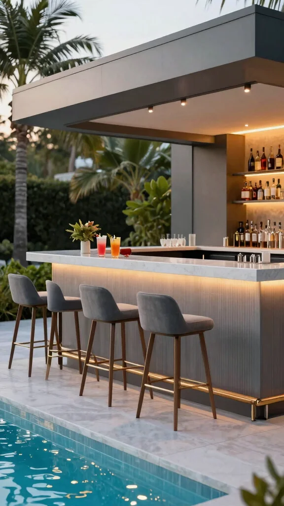 A poolside bar area can elevate your outdoor entertaining to the next level. Imagine serving drinks just steps from the water, creating a perfect atmosphere for parties or relaxing evenings. Opt for a modern design with clean lines and high stools for a chic look, or embrace rustic charm with natural wooden accents.