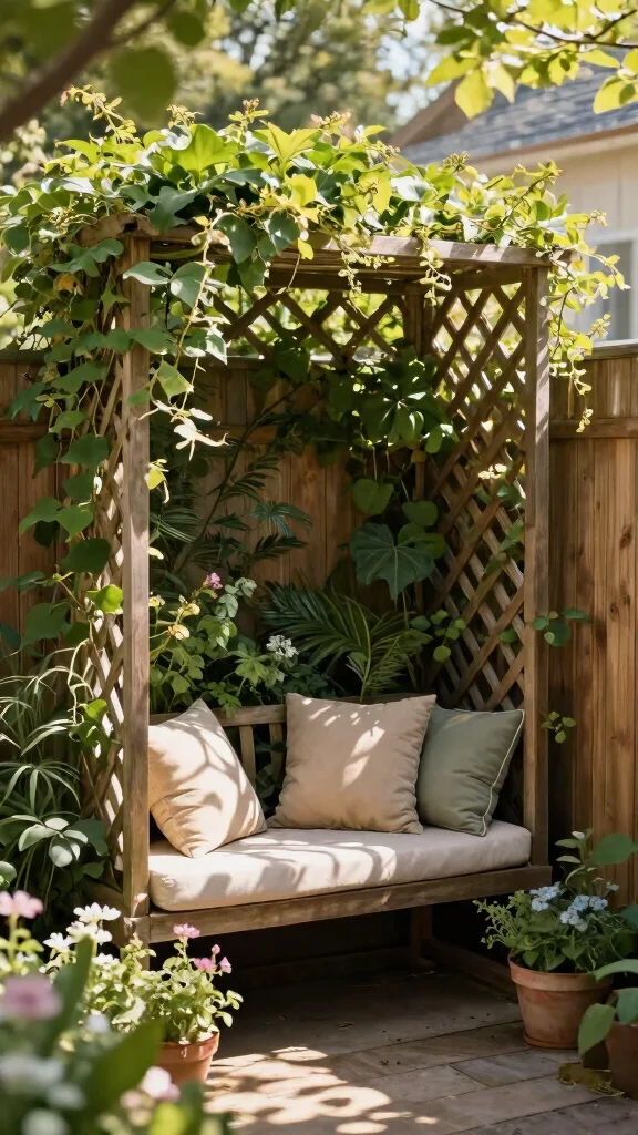 A trellis combined with built-in seating creates both privacy and functionality. This innovative design turns a corner of your garden into a cozy retreat, perfect for relaxation.