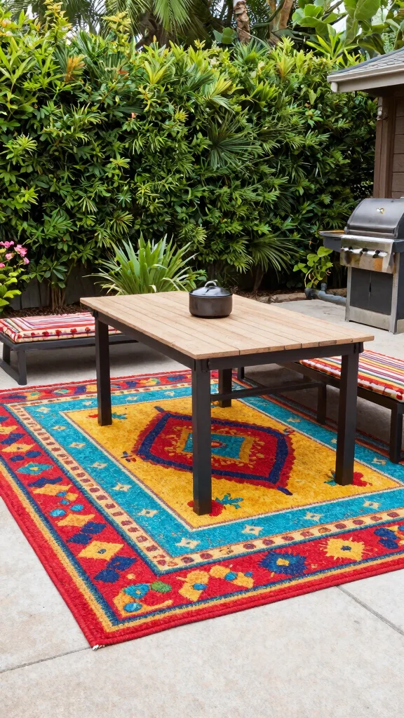 – Can I use any rug? Make sure it’s designed for outdoor use to withstand the elements.