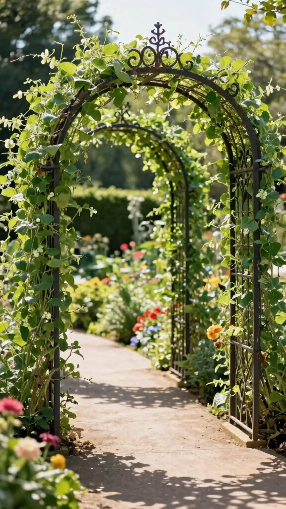 Transform your garden with a striking wrought iron arch trellis that adds elegance and functionality. This design is perfect for supporting snap peas while creating a stunning entryway or pathway. The intricate ironwork not only provides durability but also enhances the vintage charm of your garden. Train your snap peas to climb over the arch, creating a lush green canopy that’s both beautiful and practical.