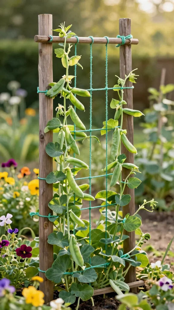 How to do it: place the stakes about 3–4 feet apart at the ends of your bed, then run 2–3 horizontal lines of twine or netting between them, spacing 6–8 inches apart. Tie the ends securely and keep the line taut. Plant snap peas at the base and gently train the vines to grab the twine as they grow. This setup delivers quick garden trellis ideas for compact gardens and makes growing snap peas effortless.