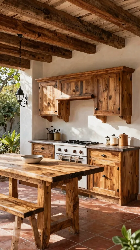 – Rustic Wooden Features: Use reclaimed wood for countertops and shelving to emphasize a rustic charm that complements Spanish architecture.