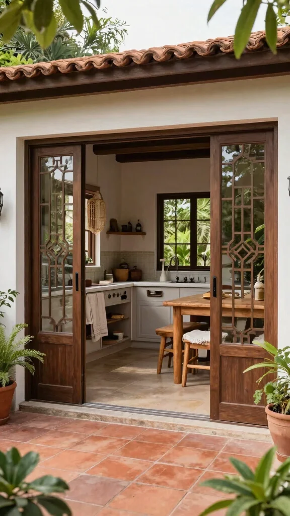 Consider creating semi-enclosed spaces in your outdoor kitchen for protection against the elements. Large glass doors or decorative screens let you enjoy the outdoors while staying sheltered from wind and rain. This thoughtful design extends the usability of your kitchen year-round. Incorporate terracotta tiles to maintain a cohesive look, and use textiles like curtains for comfort and style.