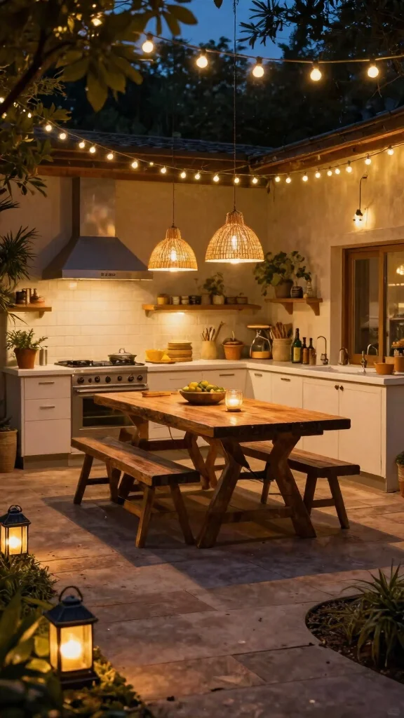 Lighting is key to creating the right atmosphere in your outdoor kitchen. Warm-toned lights complement terracotta elements and foster a cozy vibe during evening gatherings. Consider pendant lights over dining areas or string lights for a whimsical touch. Solar-powered lanterns along pathways enhance safety and charm.