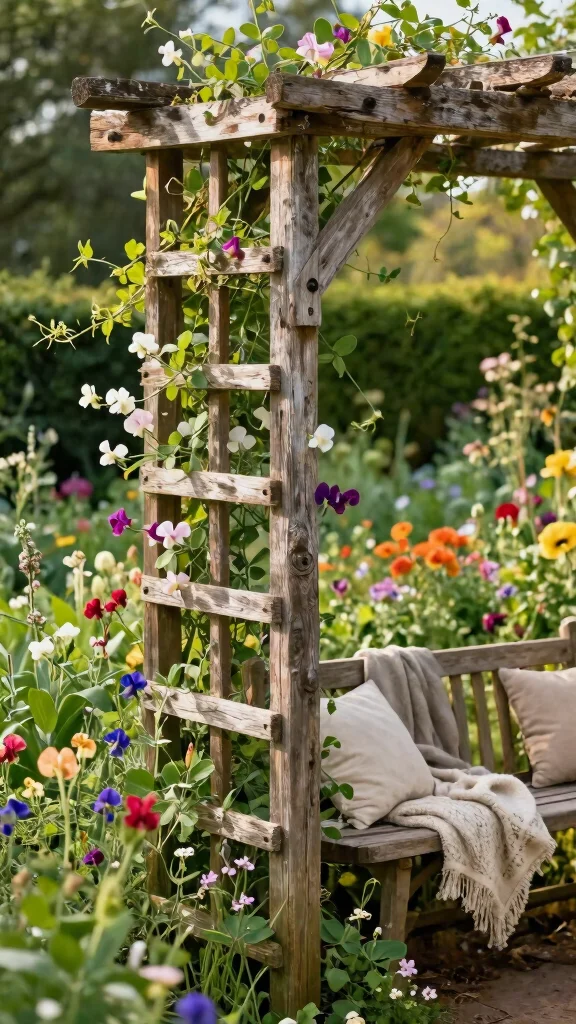 Fun fact: Vintage, reclaimed materials make a sturdy trellis for sweet pea trellis ideas and charming garden accents. Pro tip: mix old wood with a simple lattice and seal joints lightly to preserve patina while boosting airflow for healthier blooms.