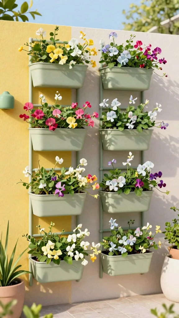 To create this innovative design, use wall-mounted trellis systems or vertical planters that allow sweet peas to climb elegantly. Choose planters that complement your wall color for a cohesive look, and position sweet peas at varying heights for dynamic visual appeal. You might also consider adding small herb planters alongside for added functionality.