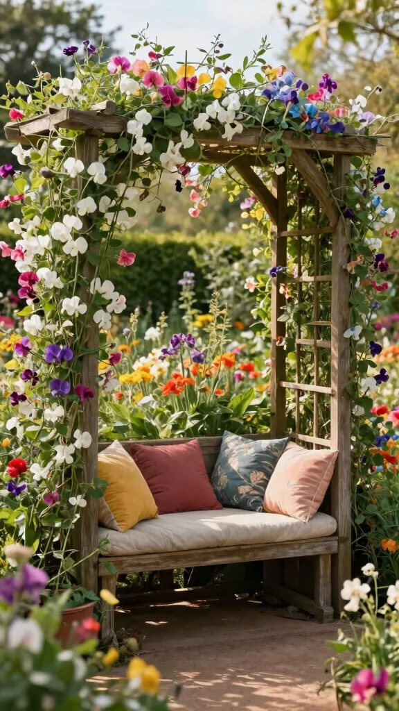 To create this multi-purpose design, build a sturdy trellis that includes a bench or seating area. Make sure the sweet peas can climb without interfering with your comfort. Adding cushions or throws can enhance the coziness, inviting you to spend more time outdoors in your lush garden.