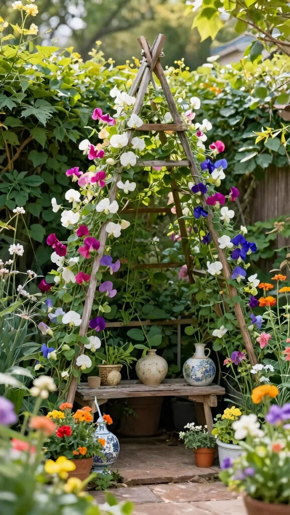 Pair your sweet peas with other light climbers like clematis, garden roses, or jasmine nearby to layer fragrance and color. Create a soft color story—pale pinks, creams, and lilacs—and place the trellis beside seating for easy enjoyment. Add a fragrant herb border and a small bench to invite lingering amidst the floral overflow. These touches elevate the romantic garden vibe while keeping maintenance simple.